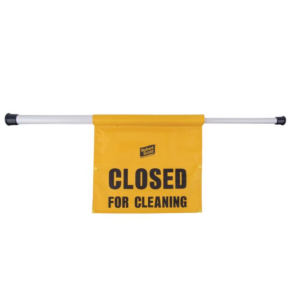 Closed for cleaning hanging sign is a handy spring-loaded bar with hanging sign, easily fits to doorways from 70-95cm to prevent entry during cleaning.